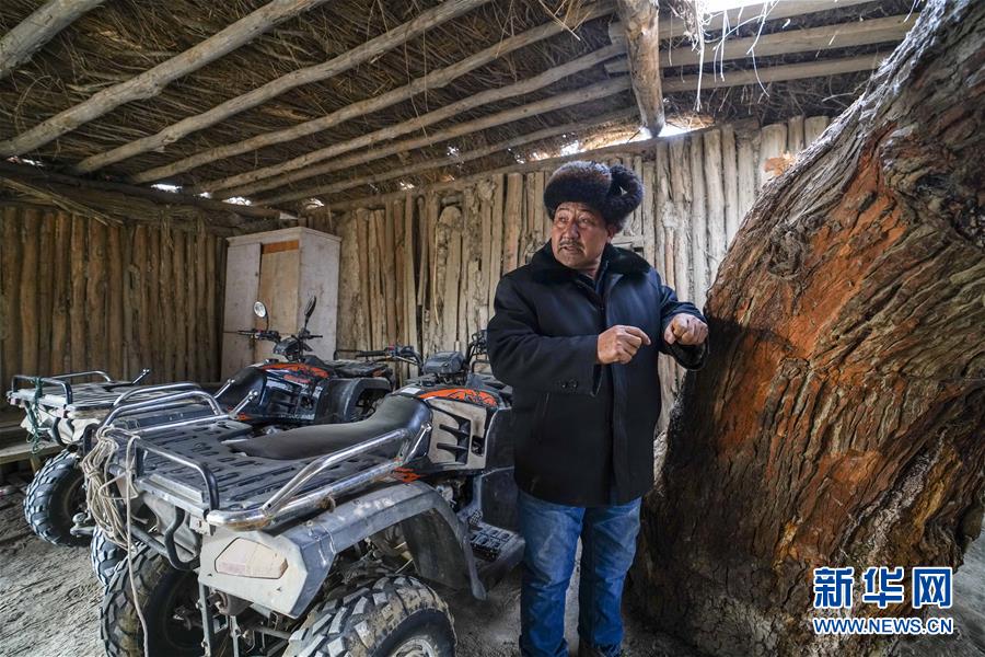 在羅布人村寨,阿木東·艾不東介紹家中的胡楊(1月29日攝)。他準備將這棵胡楊好好打造一下,吸引更多的游客到來。新華社記者 趙戈 攝