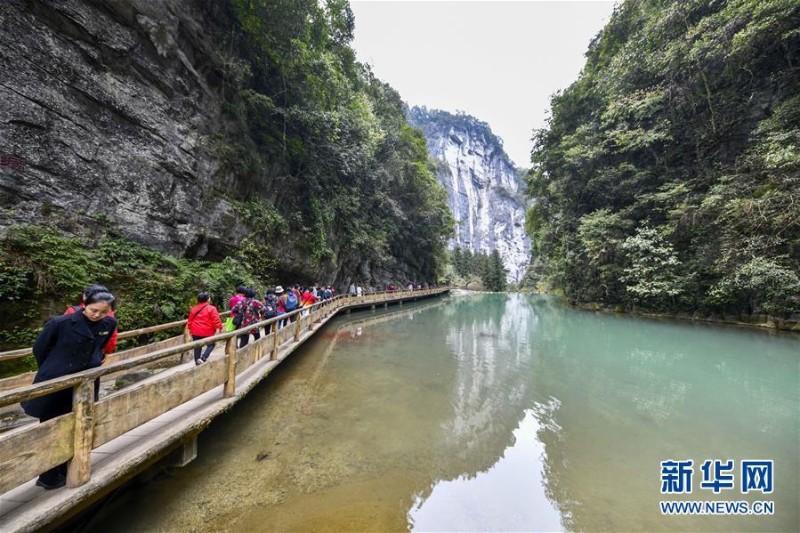 游客在天生三橋景區(qū)游覽(3月27日攝)。 隨著天氣轉(zhuǎn)暖,重慶武隆天生三橋景區(qū)風(fēng)景如畫(huà),氣勢(shì)磅礴的天生石橋和綠意盎然的山林相映成趣,吸引眾多游客前來(lái)踏春賞景。 新華社記者劉潺攝