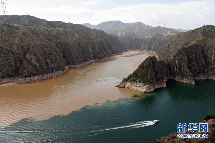 在甘肅省永靖縣劉家峽水庫(kù),一艘快艇在洮河和黃河的匯合水域行駛(6月2日攝)。