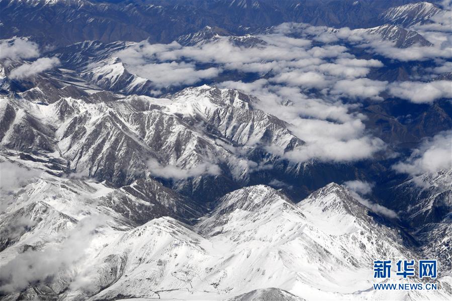 空中俯瞰祁連山腹地,白雪皚皚、云霧繚繞,尤為壯美(2018年9月19日攝)。新華社記者 范培珅 攝
