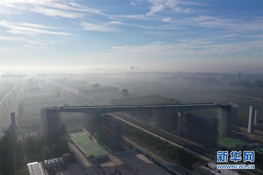 這是8月27日晨無(wú)人機(jī)拍攝的轉(zhuǎn)體完成的橋梁。 新華社記者 邢廣利 攝