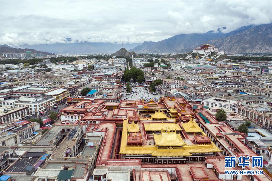 8月10日無人機(jī)拍攝的大昭寺和布達(dá)拉宮。新華社記者 王建華 攝