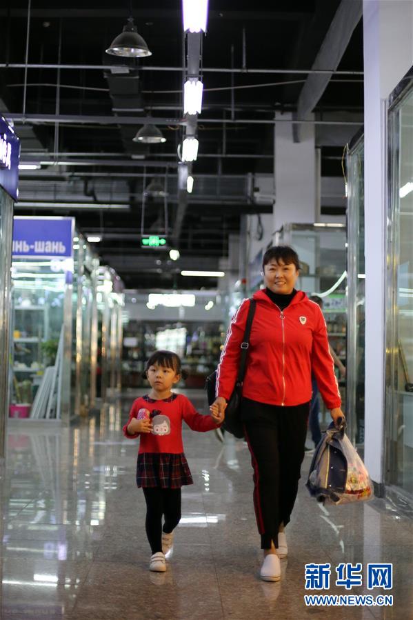 9月4日,在新疆塔城地區(qū)巴克圖口岸,塔城居民黃金瑞帶著女兒在絲路文化商品城內(nèi)采購。 新華社記者程麗攝