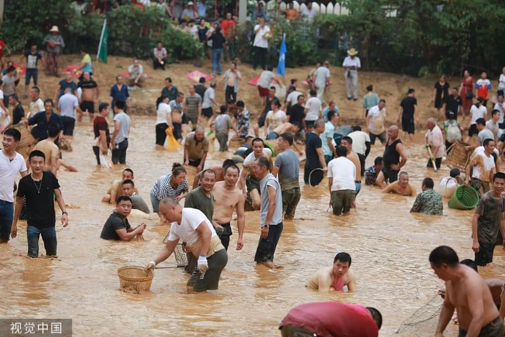 有人撒魚網,有人用網兜,還有人直接徒手捉魚,手段各異引路人圍觀。