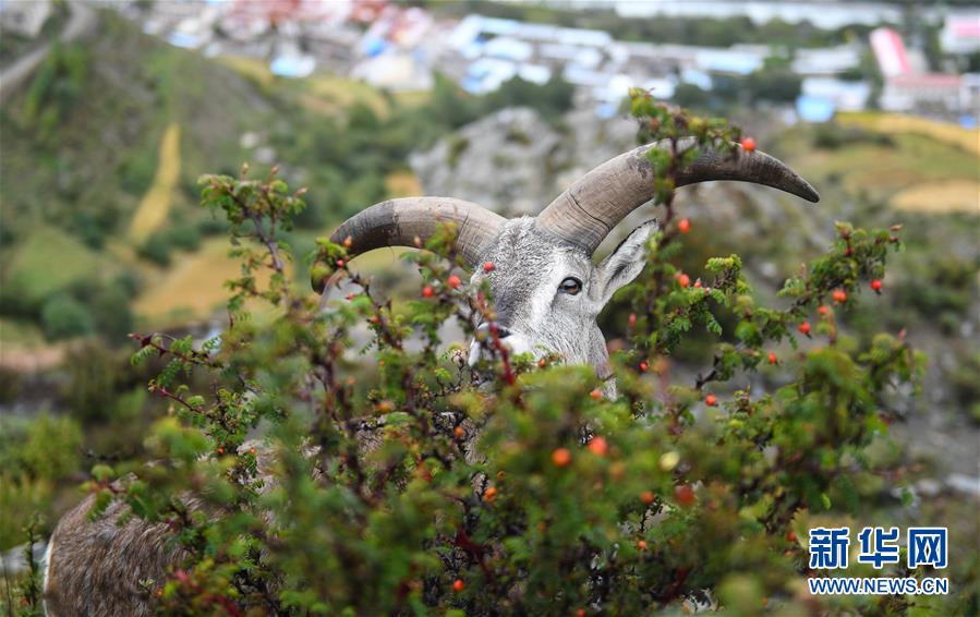 一只巖羊在西藏山南市洛扎縣色鄉(xiāng)海拔4000米左右的盤山路邊,悠閑地吃著野果青草(9月22日攝)。 新華社記者 晉美多吉 攝