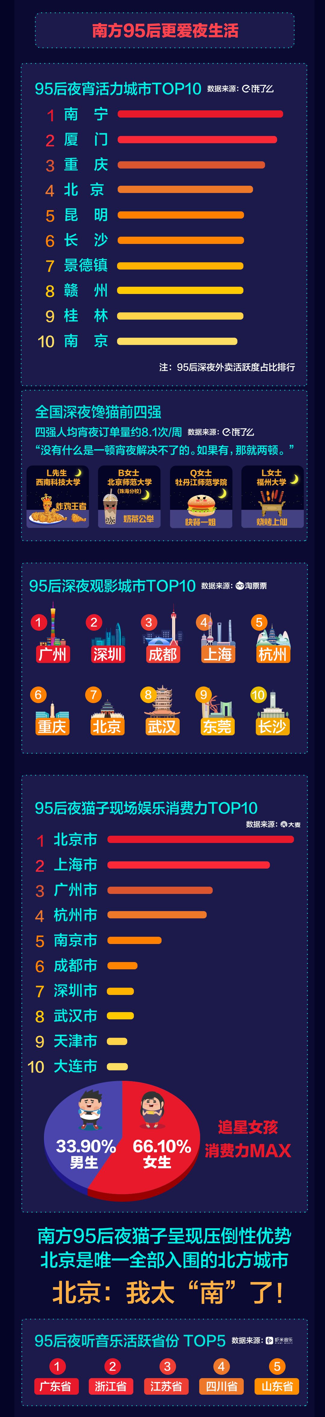 《95后夜貓子報(bào)告》綜合數(shù)據(jù)顯示,無(wú)論是觀影、追星、聽音樂(lè),還是吃宵夜,南方95后夜貓子的活躍度都呈現(xiàn)壓倒性優(yōu)勢(shì)。95后宵夜活力城市TOP10、95后深夜觀影城市TOP10、95后夜貓子現(xiàn)場(chǎng)娛樂(lè)消費(fèi)力TOP10榜單里,入圍城市均以南方城市為主。