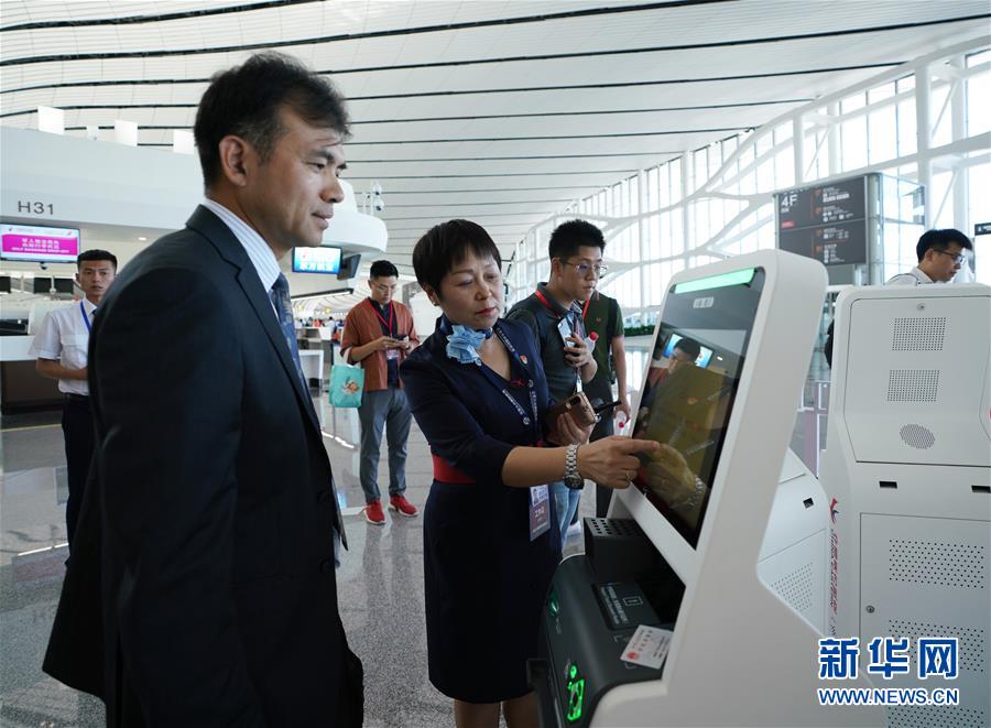 9月25日,中國(guó)南方航空公司工作人員(左)在北京大興國(guó)際機(jī)場(chǎng)介紹自助行李托運(yùn)設(shè)備。新華社記者鞠煥宗攝