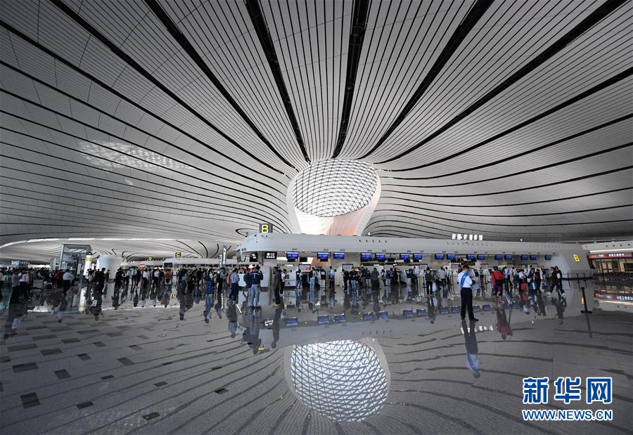 9月25日,中國(guó)南方航空公司的CZ3001次航班從北京大興國(guó)際機(jī)場(chǎng)起飛。當(dāng)日,北京大興國(guó)際機(jī)場(chǎng)正式通航。北京大興國(guó)際機(jī)場(chǎng)位于北京市大興區(qū)和河北省廊坊市廣陽(yáng)區(qū)之間,與天安門直線距離為46公里,是目前全球建設(shè)規(guī)模最大的新建機(jī)場(chǎng)。新華社記者鞠煥宗攝