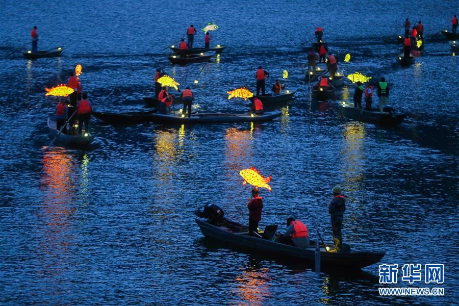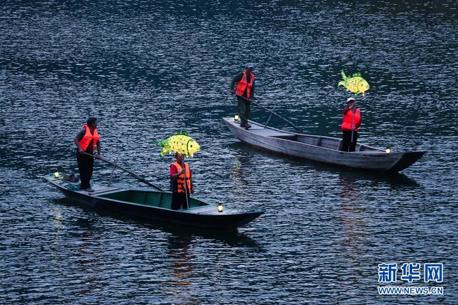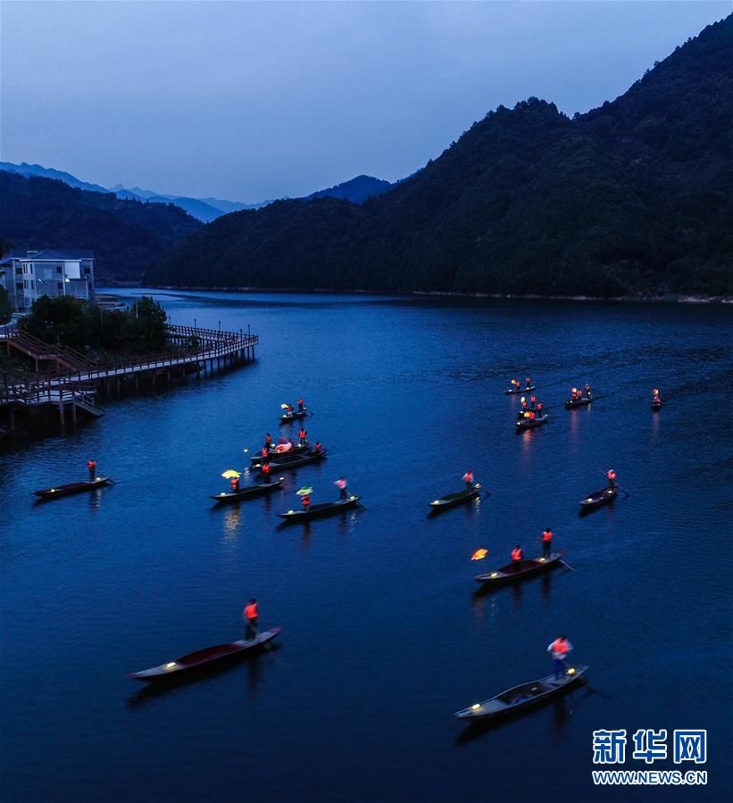 9月25日,在宋村鄉(xiāng)云源港的水面上,漁民劃著漁船,船頭點亮漁燈,構成一幅“漁舟唱晚、萬家燈火”的美麗圖景(無人機拍攝)。 近年來,浙江省杭州市淳安縣宋村鄉(xiāng)積極發(fā)展鄉(xiāng)村旅游,打造漁家元素特色景觀,助力鄉(xiāng)村振興建設。目前,宋村鄉(xiāng)依托山水景觀和漁家文化,帶動了當?shù)鼐访袼藓图碁╂宜⒆灾鸁?、農事體驗、民俗攝影采風為一體的特色旅游發(fā)展。2019年1月初至7月底,全鄉(xiāng)接待游客10萬人次,實現(xiàn)旅游經(jīng)濟收入1300萬元。 新華社記者 徐昱 攝