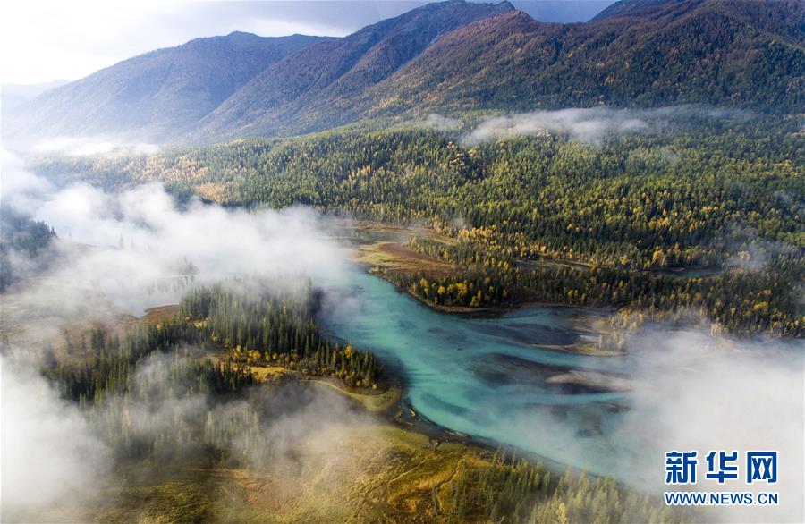 9月24日無(wú)人機(jī)拍攝的喀納斯景區(qū)風(fēng)光。 新華社記者 王菲 攝