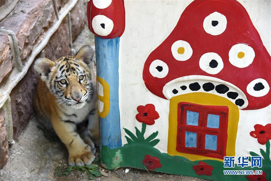 9月26日,孟加拉虎寶寶“小七”在自己的小窩里“玩?!?。 新華社記者 王凱 攝
