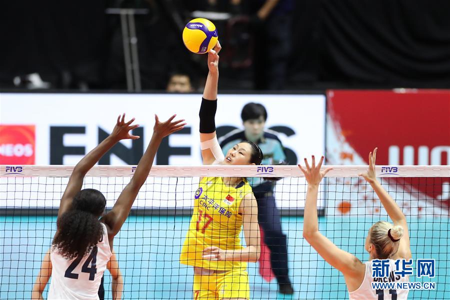 9月23日,中國隊球員顏妮(中)在比賽中扣球。當(dāng)日,在日本札幌舉行的2019年女排世界杯賽第二階段A組循環(huán)賽中,中國隊以3比0戰(zhàn)勝美國隊。新華社記者杜瀟逸攝