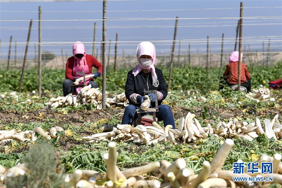 9月30日,寧夏吳忠市紅寺堡區(qū)馬渠生態(tài)移民安置區(qū)的農(nóng)民在將蘿卜切條。 新華社記者 馮開華 攝