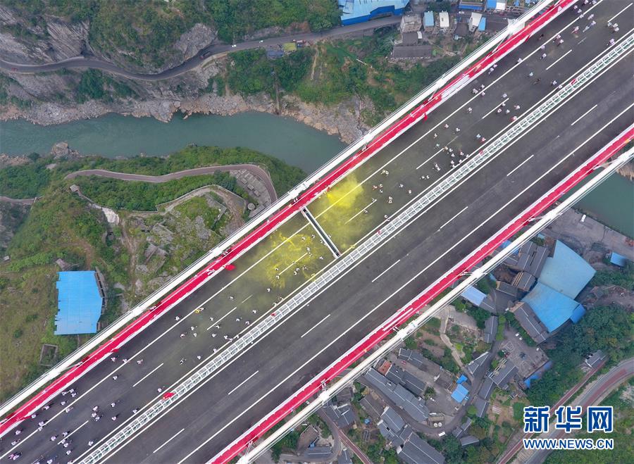 9月30日,赤水河大橋建設(shè)者以一場(chǎng)彩虹跑慶祝大橋建成(無(wú)人機(jī)攝)。新華社記者劉坤攝