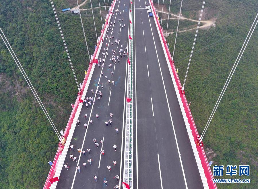 9月30日,赤水河大橋建設(shè)者以一場彩虹跑慶祝大橋建成(無人機攝)。新華社記者劉坤攝