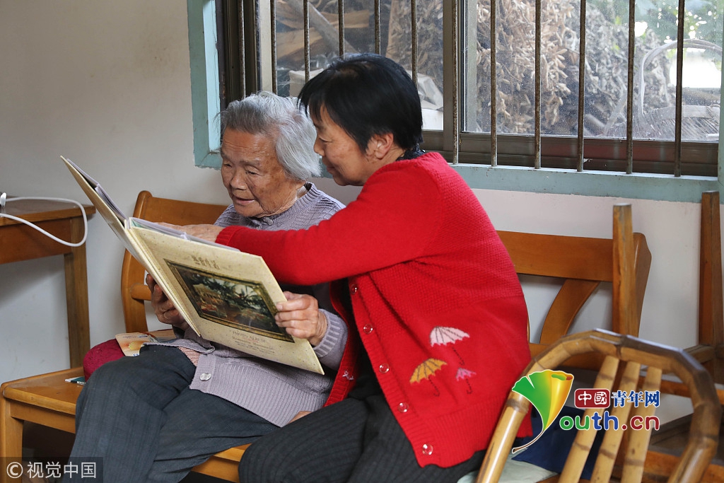 2018年10月31日,杭州,著名作家金庸的妹妹查良琇在浙江臨安家中翻看照片。