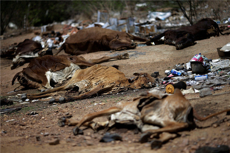 當(dāng)?shù)貢r(shí)間2017年2月12日,巴西帕拉伊巴,路上躺著牛的尸體。