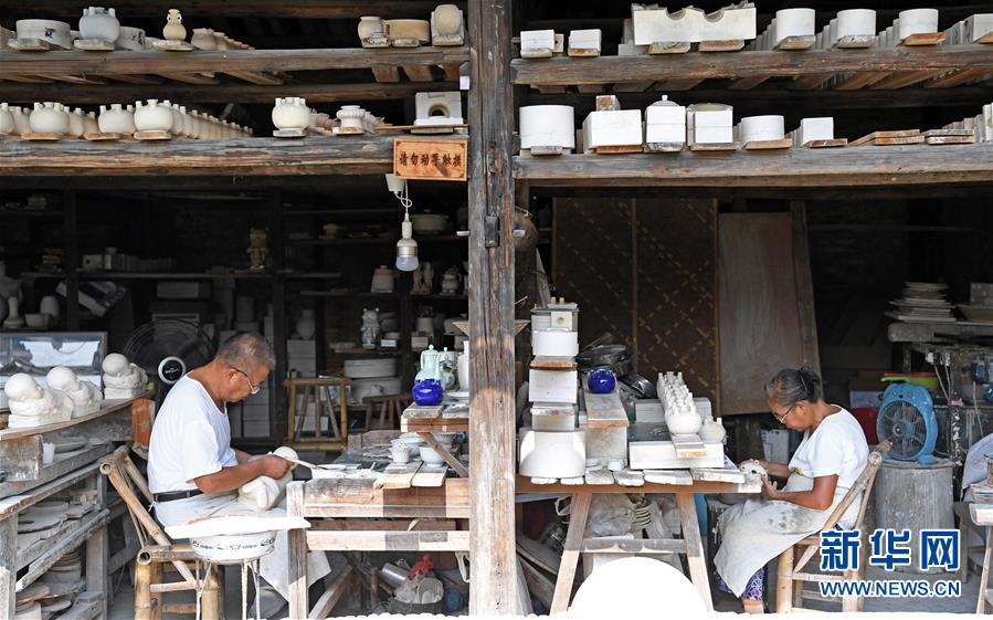 在江西景德鎮(zhèn)御窯廠遺址附近的一處老窯廠內(nèi),工匠們?cè)谥谱鞔善鳎?018年9月20日攝)。新華社記者 萬(wàn)象 攝