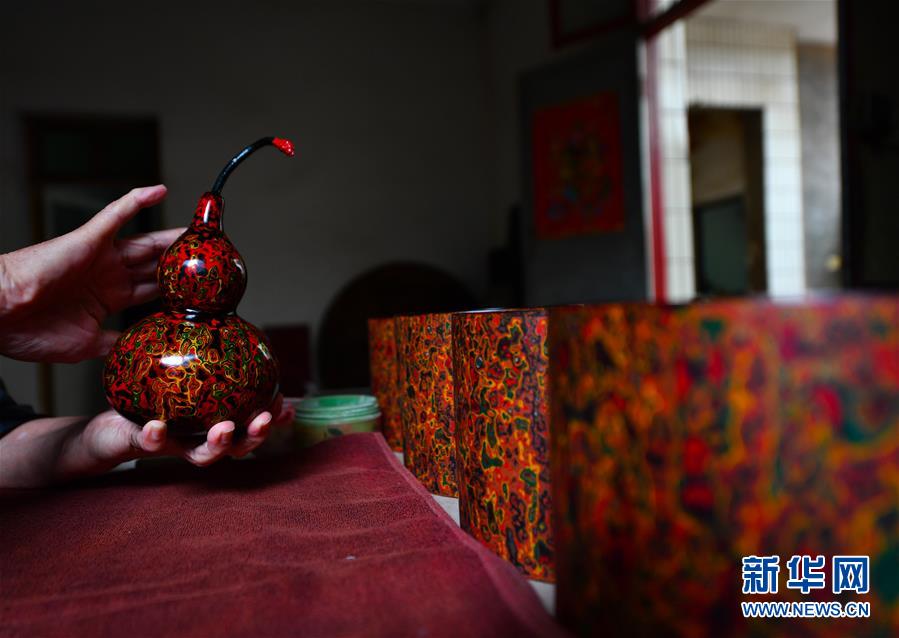 10月12日,丁國坤在家中對(duì)一件未成形的脫胎漆器進(jìn)行“彩繪”工序。新華社記者胡晨歡攝