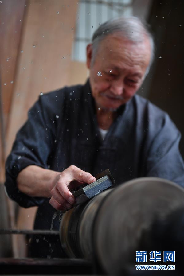 10月12日,丁國坤在家中對(duì)一件未成形的脫胎漆器進(jìn)行“水磨”工序。新華社記者胡晨歡攝