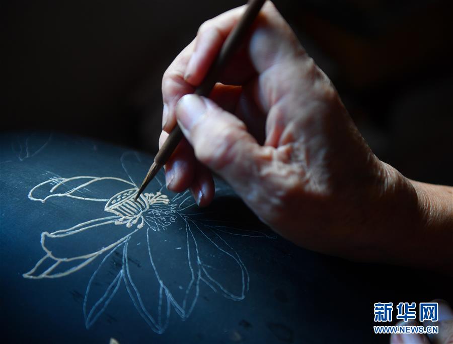10月12日,丁國(guó)坤在家中對(duì)一件未成形的脫胎漆器進(jìn)行“彩繪”工序。新華社記者胡晨歡攝
