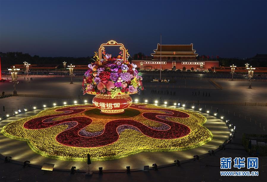 這是10月14日拍攝的天安門廣場中心花壇。 10月14日,以“花果籃”為主造型的天安門廣場中心花壇吸引了眾多游客參觀拍照?!盎ü@”的夜景更是流光溢彩,絢爛迷人。 新華社記者 殷剛 攝