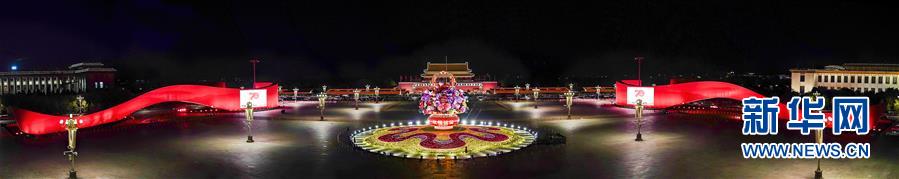 這是10月14日拍攝的天安門廣場中心花壇(全景拼接圖片)。 10月14日,以“花果籃”為主造型的天安門廣場中心花壇吸引了眾多游客參觀拍照?!盎ü@”的夜景更是流光溢彩,絢爛迷人。 新華社記者 殷剛 攝