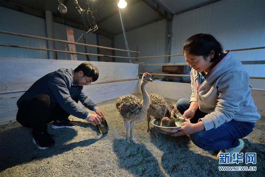 村民許俊鵬和妻子在照料小鴕鳥(niǎo)(10月14日攝)。2017年初,高谷堆村貧困戶(hù)許俊鵬一家在扶貧干部的幫助下開(kāi)始嘗試養(yǎng)殖鴕鳥(niǎo)創(chuàng)收。目前,許俊鵬一家已建成擁有20余只鴕鳥(niǎo)的養(yǎng)殖基地,平均年收入近4萬(wàn)元。 新華社記者 曹陽(yáng) 攝