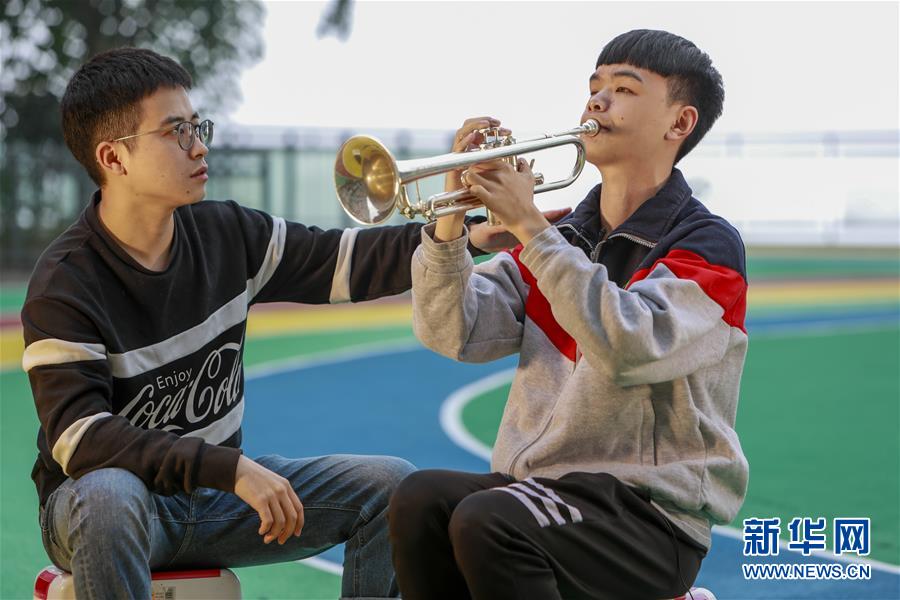 重慶市特殊教育中心的老師李沂念(左一)在教授盲童王太樊練習(xí)小號(hào)(10月10日攝)。 新華社記者 劉潺 攝