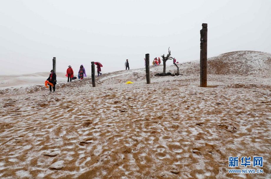 10月15日,游客在寧夏中衛(wèi)市沙坡頭景區(qū)欣賞沙漠雪景。深秋時節(jié),位于騰格里沙漠邊緣的寧夏中衛(wèi)市沙坡頭景區(qū)迎來一場降雪。漫漫黃沙被覆蓋在皚皚白雪之下,呈現(xiàn)出一種別樣的美。新華網(wǎng)杜文杰攝