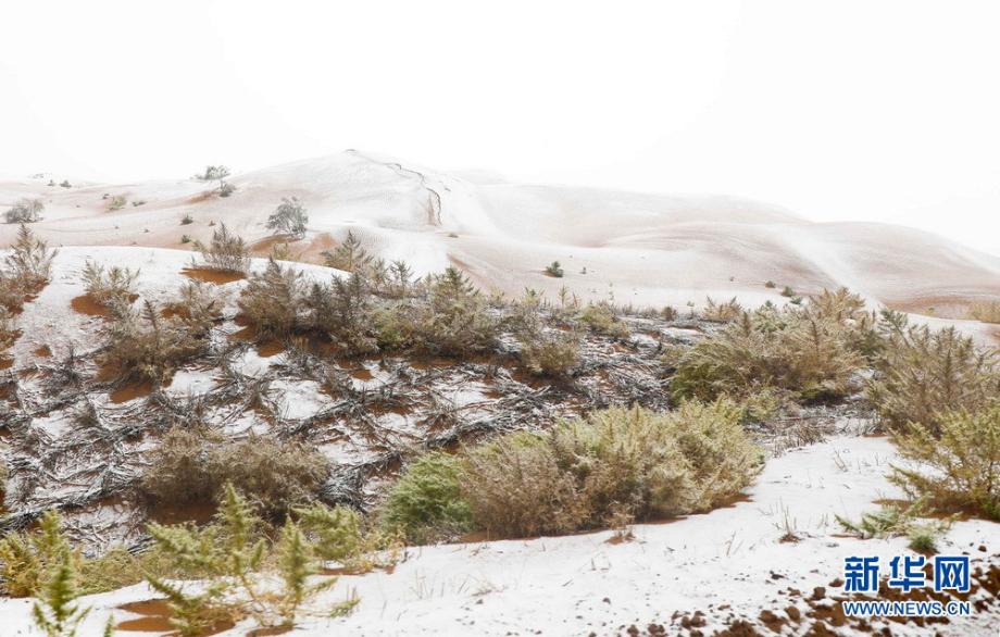 寧夏中衛(wèi)市沙坡頭景區(qū)的沙漠植物和用于治沙的草方格被大雪覆蓋(10月15日攝)。新華網(wǎng)杜文杰攝