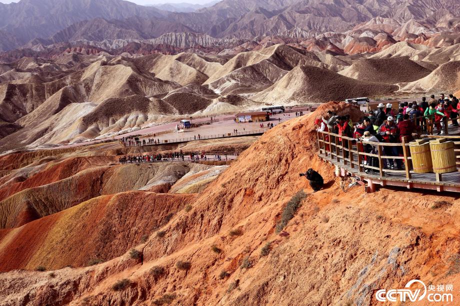 央視網(wǎng)消息:2019年10月15日,金秋時(shí)節(jié),位于甘肅省張掖市臨澤縣的七彩丹霞景區(qū)進(jìn)入旅游旺季,吸引眾多游人紛至沓來(lái)。張掖七彩丹霞景區(qū),分布面積約50公里,是中國(guó)北方干旱地區(qū)發(fā)育最典型的丹霞地貌。在方圓數(shù)十平方公里的范圍內(nèi),隨處可見(jiàn)有紅、黃、橙、綠、白等多種鮮艷的色塊或線條,把一座座山峰,一條條溝壑,裝點(diǎn)成一幅幅絢麗多姿、燦爛奪目的畫(huà)圖。圖片來(lái)源:視覺(jué)中國(guó)