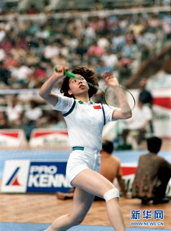 圖為韓愛萍在韓國漢城(首爾)舉行的第十屆亞洲運動會羽毛球女子單打比賽中擊球(資料照片),她最終奪得女單冠軍。新華社記者胡越攝