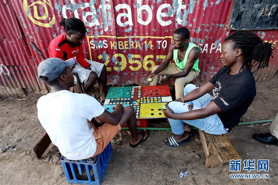 10月16日,在肯尼亞內(nèi)羅畢基貝拉貧民窟,人們在街邊玩桌游。新華社記者王騰攝