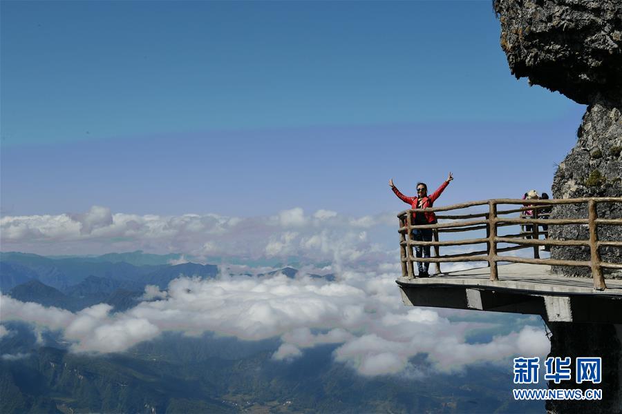 10月17日,游客在漢中市南鄭區(qū)龍頭山風(fēng)景區(qū)拍照。 陜西省漢中市南鄭區(qū)龍頭山風(fēng)景區(qū)位于川陜交界處米倉山主梁。龍頭山景區(qū)常年云霧繚繞,宛如仙境,還有奇石、云海、彩林、霧凇等景觀令游客流連忘返。 新華社記者 張博文 攝