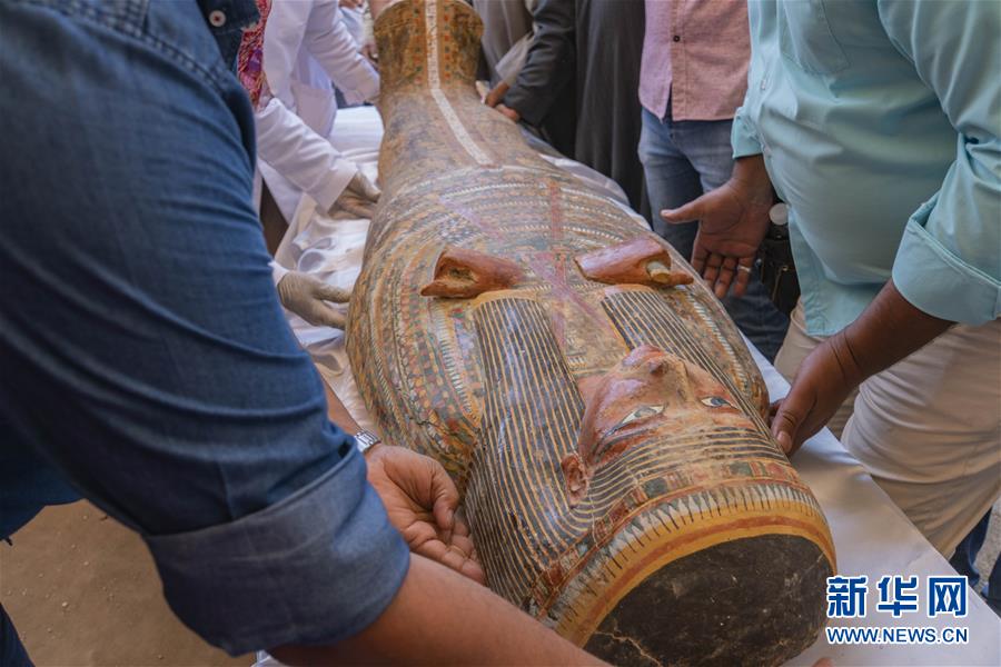 這是10月19日在埃及盧克索拍攝的近期發(fā)掘出的棺槨。 埃及文物部19日在南部城市盧克索舉行的新聞發(fā)布會上宣布,埃及考古隊(duì)近期發(fā)掘出30具3000年前的木質(zhì)棺槨。 新華社記者 李碧念 攝