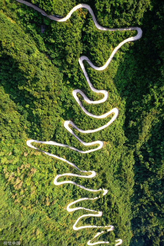 天門山盤山公路位于湖南省張家界市境內(nèi)的國家森林公園天門山上,盤山公路全長10.77公里,海拔從200米急劇提升到1300米,大道兩側(cè)絕壁千仞,空谷幽深,共計99個彎,180度急彎此消彼長,似玉帶環(huán)繞,航拍鏡頭下蜿蜒曲折的道路彎彎緊連,層層迭起,宛如迷宮般的“納斯卡線條”,被譽(yù)為“天下第一公路奇觀”,同時它也是世界上最危險的十大公路之一。