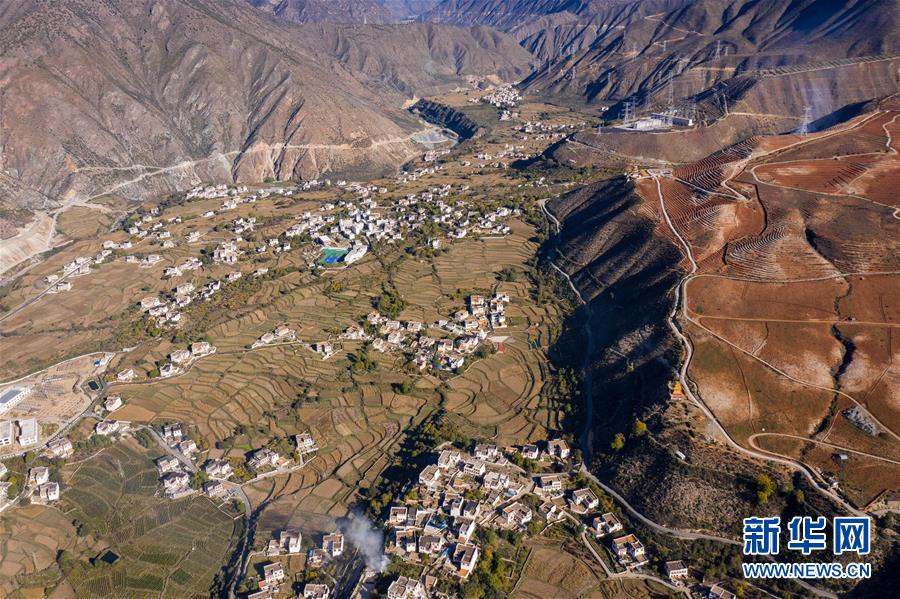 10月29日,俯瞰四川省鄉(xiāng)城縣的定曲河峽谷的青德鄉(xiāng),白色藏房點(diǎn)綴在田園之中(無(wú)人機(jī)拍攝)。新華社記者江宏景攝