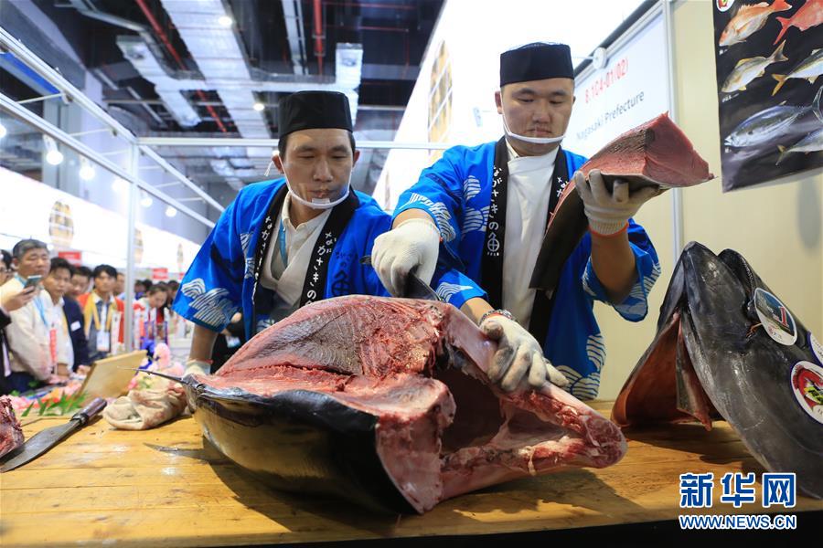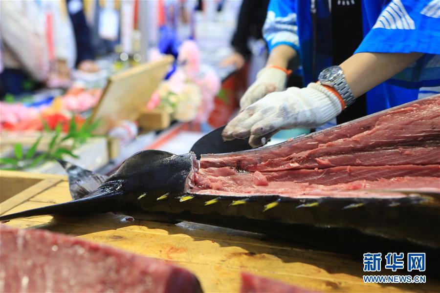 新11月7日,來自日本長崎魚市株式會社的專業(yè)切魚師傅在現(xiàn)場解體70公斤藍(lán)鰭金槍魚。第二屆中國國際進口博覽會正在上海國家會展中心舉行。博覽會的食品及農(nóng)產(chǎn)品展區(qū)里匯集了來自世界各地的美食,同時也上演各種精彩美食秀。11月7日,來自日本長崎魚市株式會社的專業(yè)切魚師傅現(xiàn)場解體一條70公斤的藍(lán)鰭金槍魚,吸引大量參觀者觀看、品嘗。新華社記者隋先凱攝