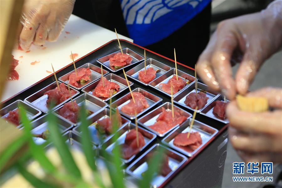 11月7日,切魚師傅為參觀者準備用于品嘗的藍鰭金槍魚魚肉。第二屆中國國際進口博覽會正在上海國家會展中心舉行。博覽會的食品及農產品展區(qū)里匯集了來自世界各地的美食,同時也上演各種精彩美食秀。11月7日,來自日本長崎魚市株式會社的專業(yè)切魚師傅現(xiàn)場解體一條70公斤的藍鰭金槍魚,吸引大量參觀者觀看、品嘗。新華社記者隋先凱攝