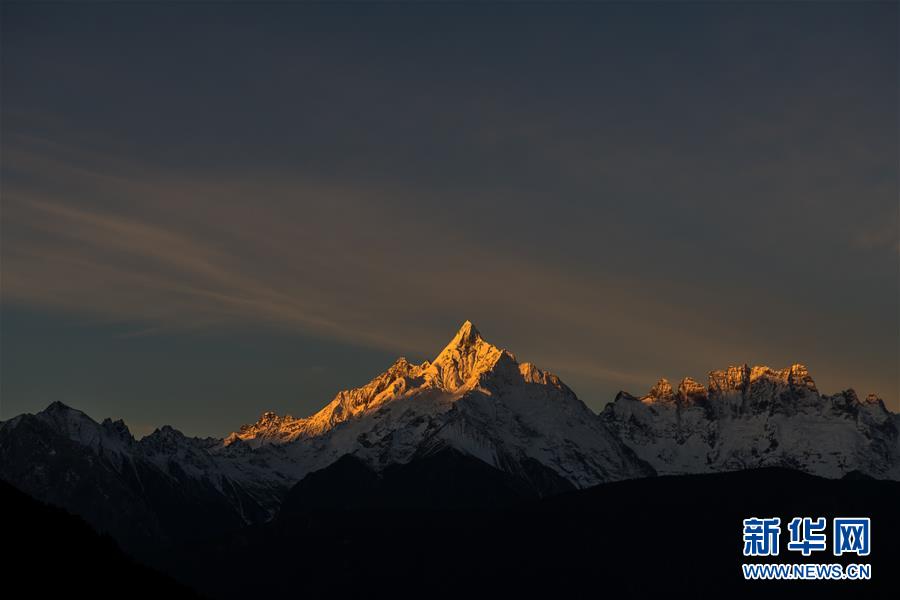 日出時(shí)分,陽光照射在梅里雪山緬茨姆峰上(11月8日攝)。 初冬時(shí)節(jié),位于云南省西北部的迪慶藏族自治州境內(nèi)的梅里雪山、普達(dá)措、納帕海、白水臺(tái)等景色迷人。 新華社記者 胡超 攝