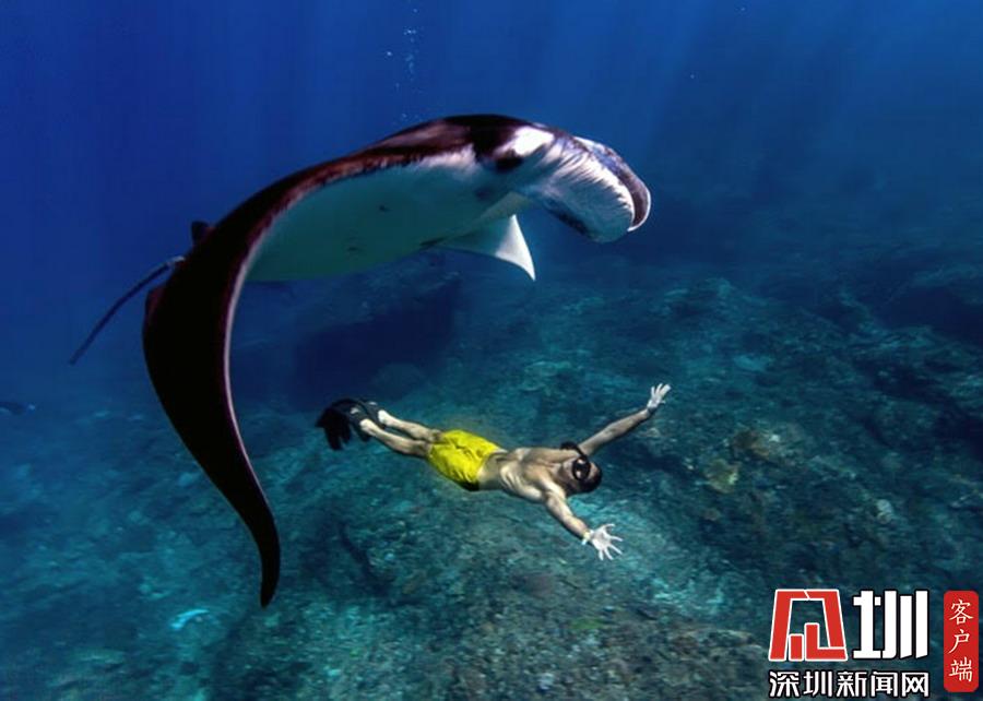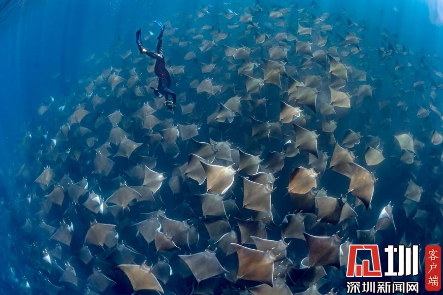 2019年7月2日報道(具體拍攝時間不詳),印度尼西亞科莫多國家公園,美國自由潛水愛好者Kristina Zvaritch一次潛水時,她的正下方恰巧游著幾只巨大的蝠鲼,這令人驚艷的一幕恰巧被她的丈夫拍下來了。當(dāng)她看到這些照片時,自己都被驚呆了。晶瑩剔透的海水使這張照片有了視覺錯位的效果,讓人以為Kristina與這些魚處于相同的高度,但實際上她離這些魚還有10-19英尺左右的距離。