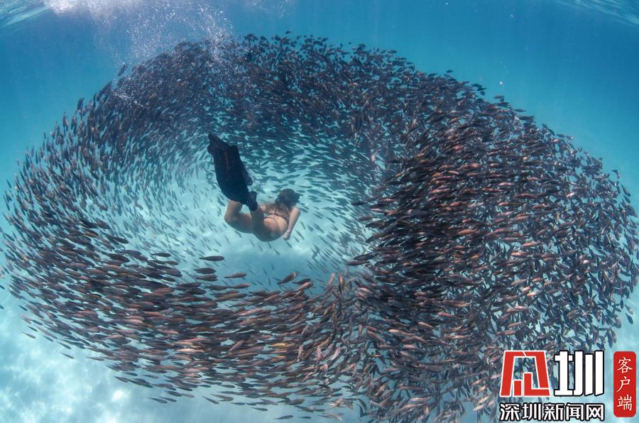 2018年12月24日報道(具體拍攝時間不詳),這張驚艷的照片記錄了沙丁魚大軍為一位幸運的潛水員讓路的瞬間,數(shù)百萬條銀光閃閃的小魚兒簇?fù)韲@在他的一側(cè),恰似熠熠生輝的繁星,如眾星捧月一般畫面十分驚艷。