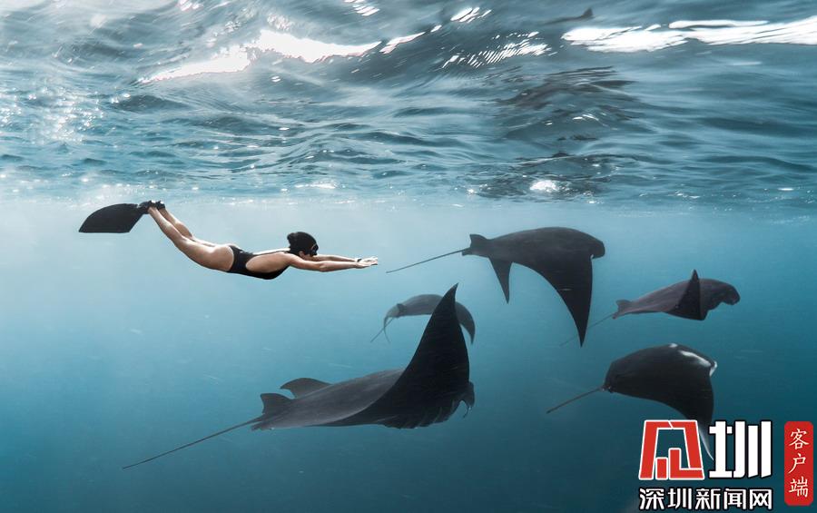 29歲的自由潛水教練Yahia Barakah拍攝了一組妻子Kristina Zvaritch和好友Fiona Fehrsen以及Georgie White潛水時與蝠鲼、儒艮、海龜?shù)群Q髣游铩巴巍钡木收掌嬅媸终鸷?。這些照片是今年早些時候在印尼科莫多國家公園水下拍攝的,晶瑩剔透的海水使照片有視覺錯位的效果,讓人以為潛水者與這些海洋動物的距離十分接近觸手可及。