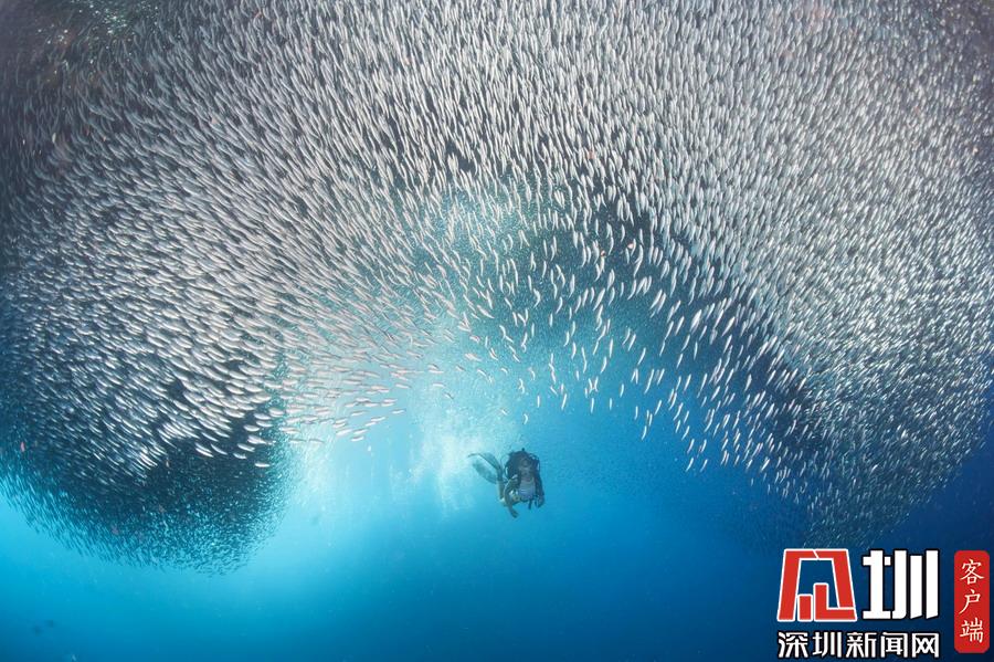 2018年12月24日?qǐng)?bào)道(具體拍攝時(shí)間不詳),這張?bào)@艷的照片記錄了沙丁魚大軍為一位幸運(yùn)的潛水員讓路的瞬間,數(shù)百萬條銀光閃閃的小魚兒簇?fù)韲@在他的一側(cè),恰似熠熠生輝的繁星,如眾星捧月一般畫面十分驚艷。