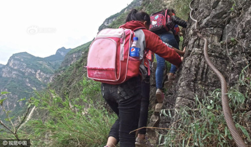 上學的孩子都背著沉沉的書包,大多數(shù)是女孩,15個孩子在三個家長的保護下,大約用了2個小時,到達“懸崖村”。上山容易下山難,遇到雨雪天氣,村里人就不再外出了。 圖片來源:視覺中國