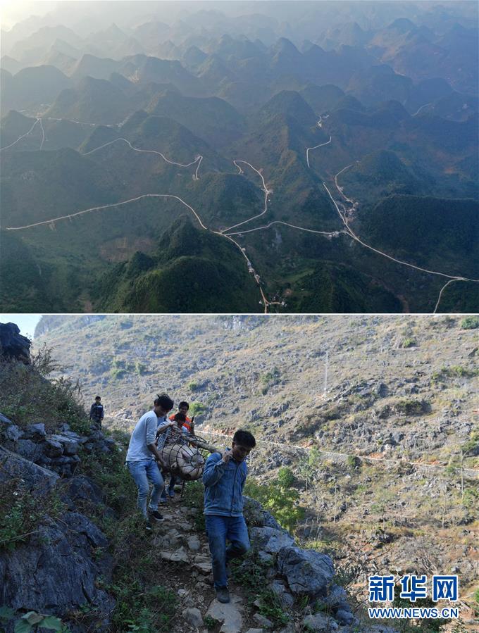 拼版照片:上圖為已經(jīng)修通水泥路的大化瑤族自治縣板升鄉(xiāng)八好村八好屯(11月11日無人機拍攝);下圖為在尚未通路的八好村八好屯,村民背著年貨走山路回家(2016年1月26日攝)。新華社記者 黃孝邦 攝