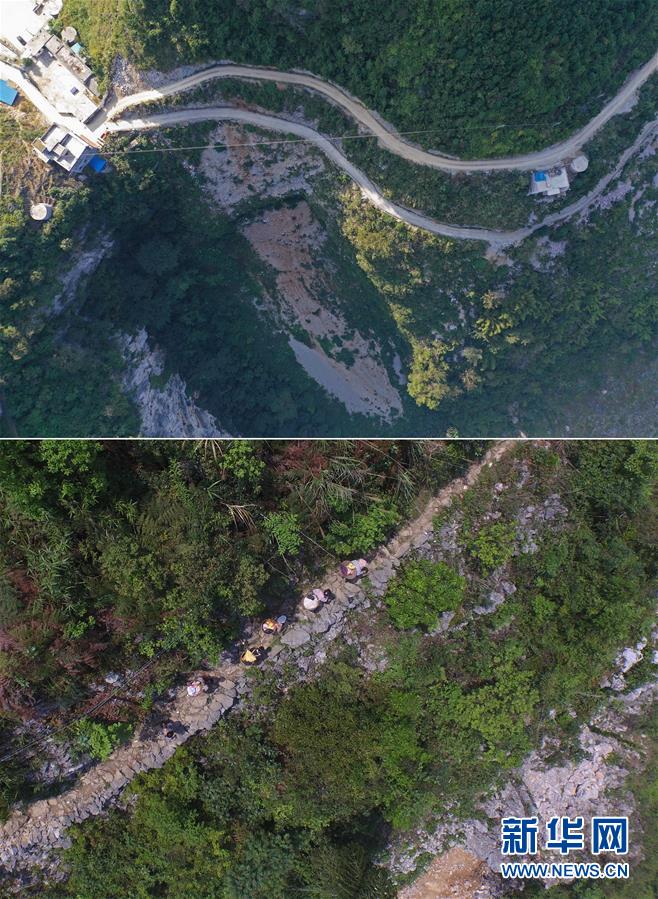 拼版照片:上圖為已經修通水泥路的大化瑤族自治縣板升鄉(xiāng)八好村八好屯(11月11日無人機拍攝);下圖為在尚未通路的八好村八好屯,村民背著化肥走山路回家(2016年4月15日攝)。新華社記者 黃孝邦 攝