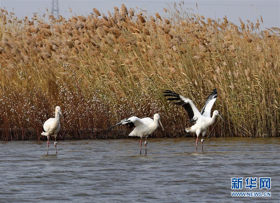 這是在樂亭縣野生動(dòng)物保護(hù)協(xié)會(huì)大清河鳥類救助站放飛回歸大自然的三只國家一級(jí)保護(hù)動(dòng)物東方白鸛(11月16日攝)。新華社記者楊世堯攝