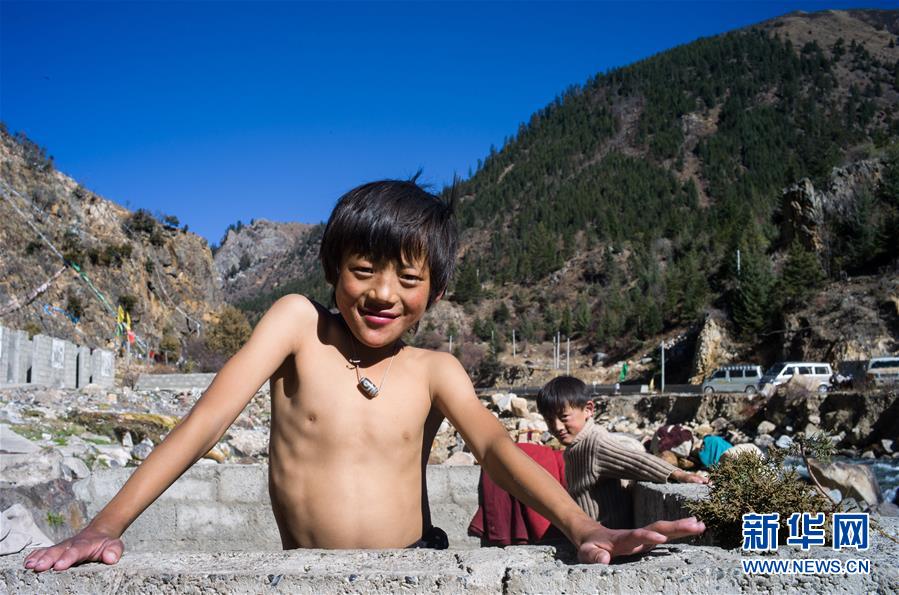 在318國道邊的四川巴塘縣德達溫泉,小朋友在沐浴(10月18日攝)。新華社記者江宏景攝